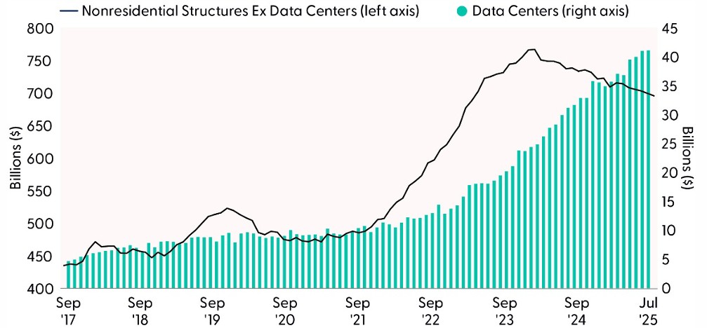 Capital spending on nonresidential structures, which include a wide range of buildings from offices to hospitals, has declined for the past two years. The bright spot is in data centers. The Census Bureau first broke out data center construction as a distinct line item in its Monthly Construction Spending report in July 2025, released on September 2, 2025. This addition reflects the growing economic significance of data center investment, particularly as AI related infrastructure spending surges. The new categorization allows for more precise tracking of capital flows into digital infrastructure, which has become a key driver of nonresidential private construction.