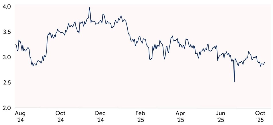 While falling yields and the prospect of further rate cuts have buoyed equity markets, they also raise concerns about how much lower yields can go before signaling deeper economic trouble. Treasury yields reflect expectations for growth and inflation, so a continued downtrend in rates would likely require further signs of economic deceleration and easing price pressures. With the labor market already nearing stall speed, the scope for additional downside in yields may be limited before recession fears begin to resurface.