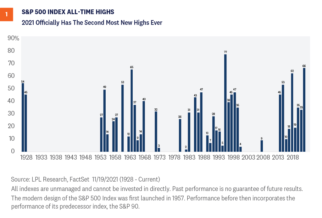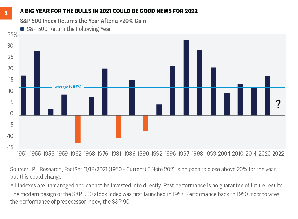 Thanks to a combination of continued healthy earnings, adaptable U.S. corporations and workforces, a solid U.S. consumer, and the tailwinds of both monetary and fiscal policy, we continue to expect stocks to do well in 2022, outperforming bonds once again. We won’t quite give away our forecasts at this time, as we will do that on December 7, when we will officially release our 2022 Outlook. But in the meantime, it looks like a strong year in 2021 could bode well for continued gains in 2022.